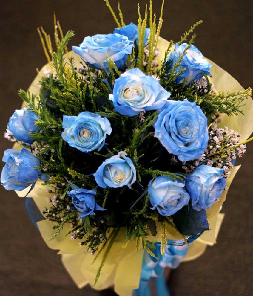 A round bouquet of 1 dozen blue roses spray.
