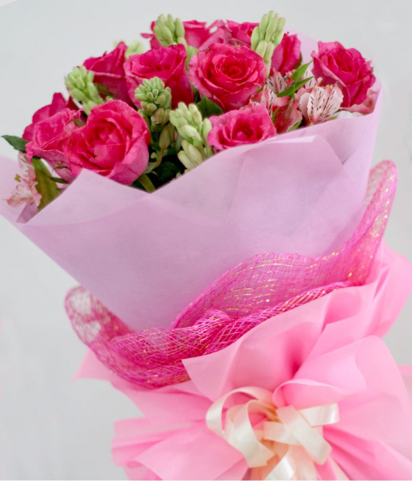 A round bouquet of 1 dozen pink roses with tube rose and alstro.