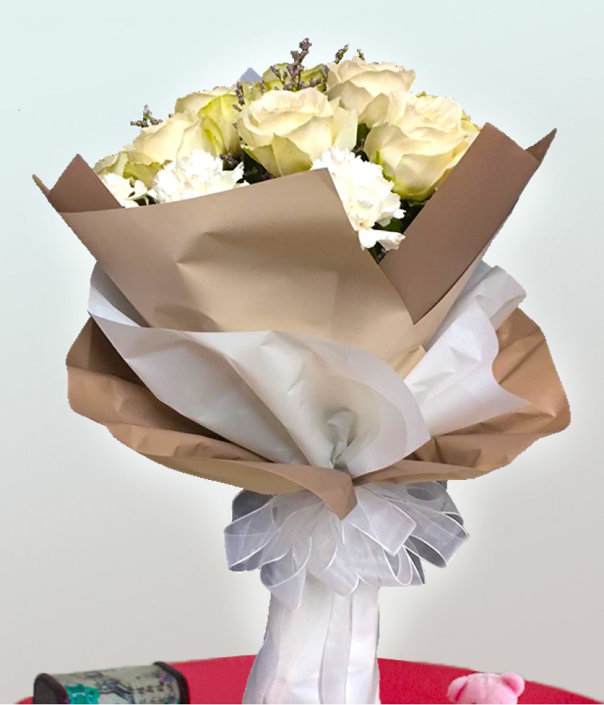 An elegant bouquet of 1 dozen white imported roses and white carnation