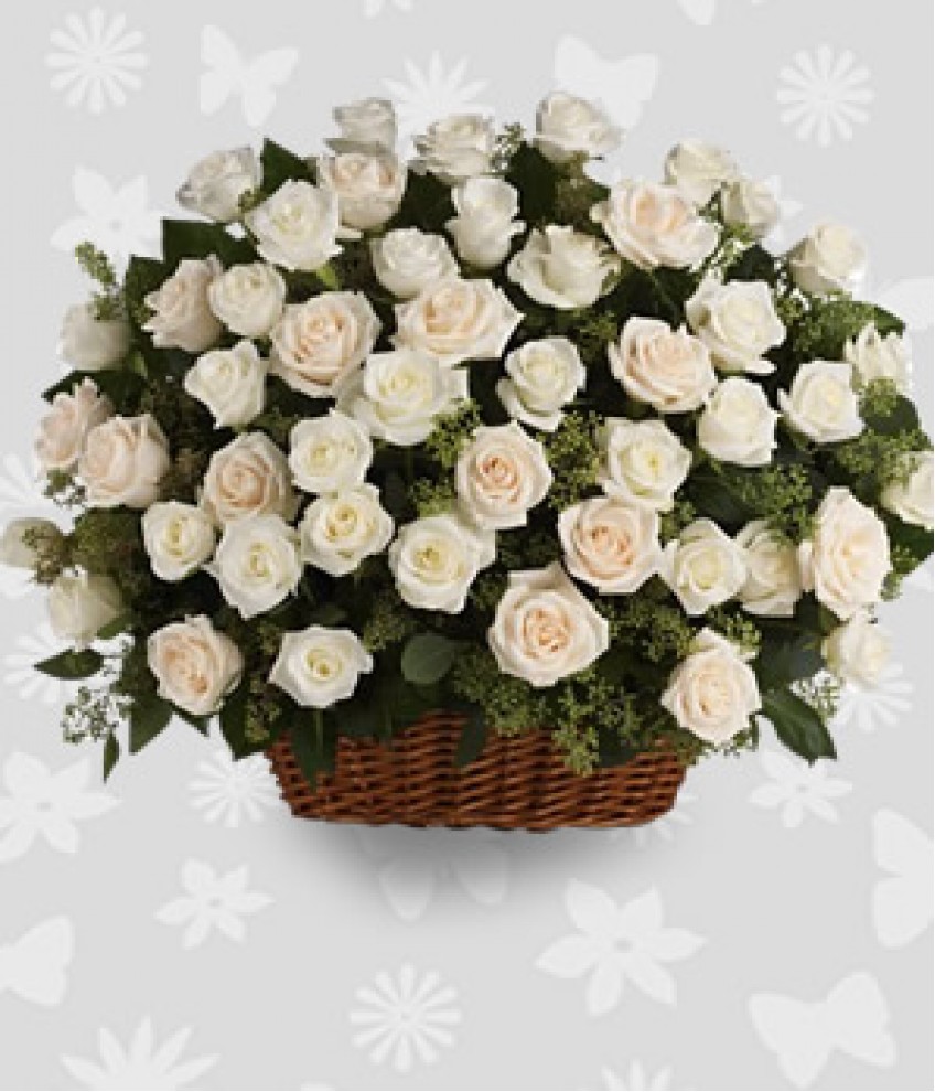 Luminous white and creme roses, presented with fragrant seeded eucalyptus in a large, rectangular basket.