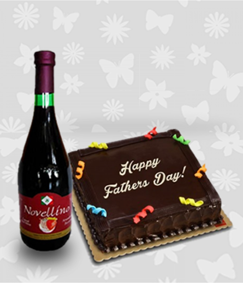 A 12x12 chocolate cake with fudgy chocolate icing and topped with colorful sugar confetti and 750ml. of Novellino Passion Strawberry Wine.